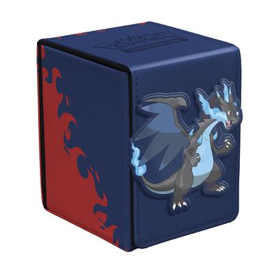 The Alcove® Flip Deck Box® for the Pokémon Trading Card Game features vibrant, full-color artwork of Mega Charizard X on a multi-layer leatherette finish, with a strong magnetic closure, and dual thumb notches for easy access to your deck. This Deck Box holds up to 100 standard-size trading cards double-sleeved in Ultra PRO Deck Protector® sleeves.
